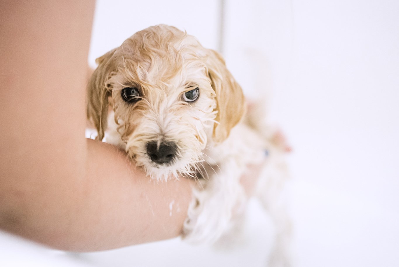 Udați bine blana câinelui cu apă caldă.